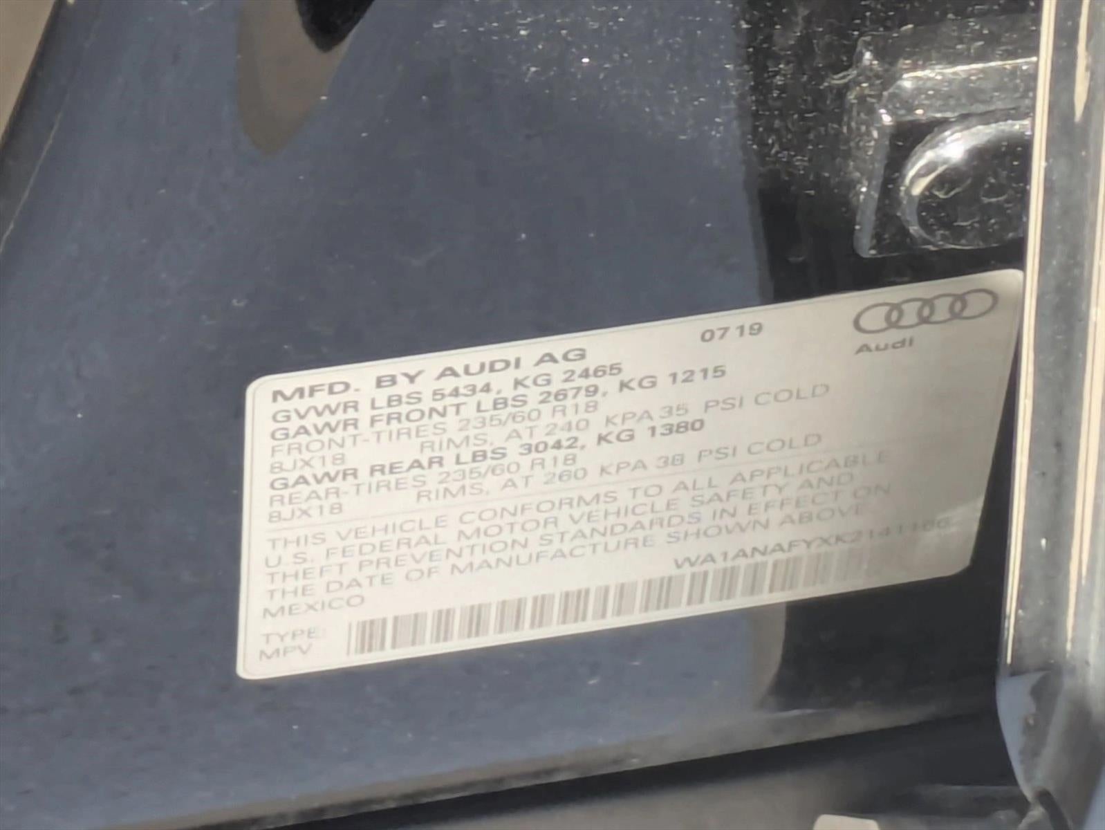 This 2019 Audi Q5 Premium is offered to you for sale by AutoNation Toyota Weston. This Audi includes: NOUGAT BROWN, LEATHER SEATING SURFACES Leather Seats DELETE FRONT LICENSE PLATE HOLDER AUDI GUARD PROTECTION KIT Floor Mats CONVENIENCE PACKAGE Keyless Start HD Radio Mirror Memory Seat Memory Hands-Free Liftgate Satellite Radio Power Door Locks Keyless Entry Blind Spot Monitor Power Folding Mirrors Cross-Traffic Alert Remote Trunk Release BRILLIANT BLACK USB CABLES PANORAMIC SUNROOF Generic Sun/Moonroof Sun/Moonroof Dual Moonroof *Note - For third party subscriptions or services, please contact the dealer for more information.* Perfect for the on-the-go family, this Audi Q5 Premium is an SUV everyone will love. With exceptional mileage, options and power, you'll insist on driving it on all your outings. Sophistication & understated luxury comes standard on this Audi Q5 Premium. Well-known by many, the Q5 has become a household name in the realm of quality and prestige. Navigate through all the icky weather with ease in this AWD-equipped Audi Q5, and even get non-stop traction for your non-stop lifestyle! In addition to the amazing traction control, you may even qualify for an insurance reduction with this AWD vehicle. Low, low mileage coupled with an exacting maintenance program make this vehicle a rare find. Added comfort with contemporary style is the leather interior to heighten the quality and craftsmanship for the Audi Q5 Premium.